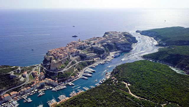Et bien, il n’est pas bien difficile de reconnaître dans cette description le site de Bonifacio. Un port avec une entrée étroite, des falaises de part et d’autre et une ville haute.