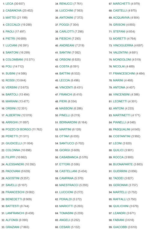 Une chose est à signaler. Le nom de famille donne aussi une indication forte sur l’origine géographique. L’exemple le plus connu est celui des gens de Cargèse qui ont des patronymes venant du grec. Et quant à moi, mon nom de famille qui figure dans la liste sans être très répandu, m’assure que celui le porte vient de mon village ou en tous cas ses ancêtres.